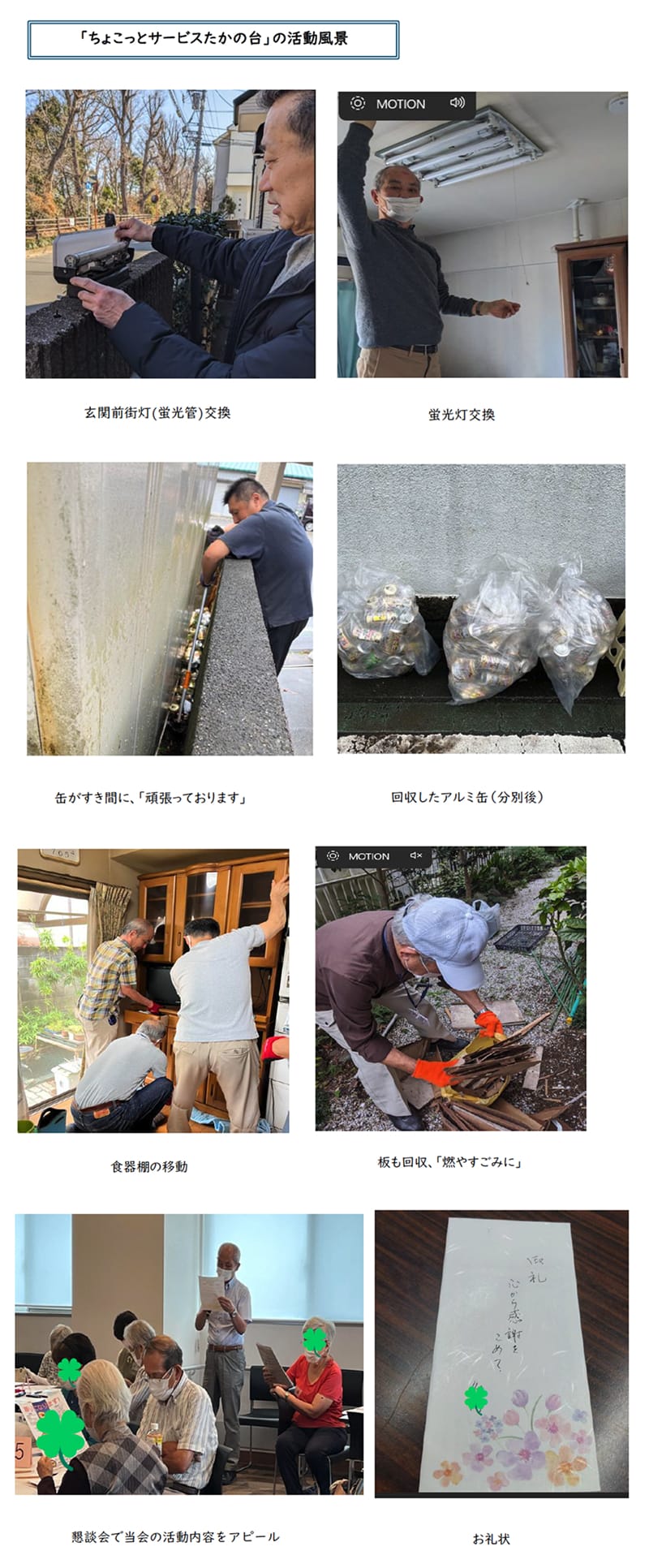 ・依頼内容は、蛍光灯交換、空き缶回収、家具移動、落ち葉処理、廃材処理等(写真ご参照)。