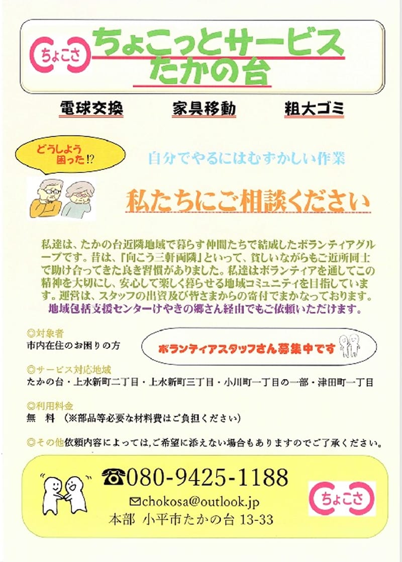 ・「ちょこっとサービスたかの台(ちょこさ)」は地域のお困りごとを手助けすることを目的に発足しました。