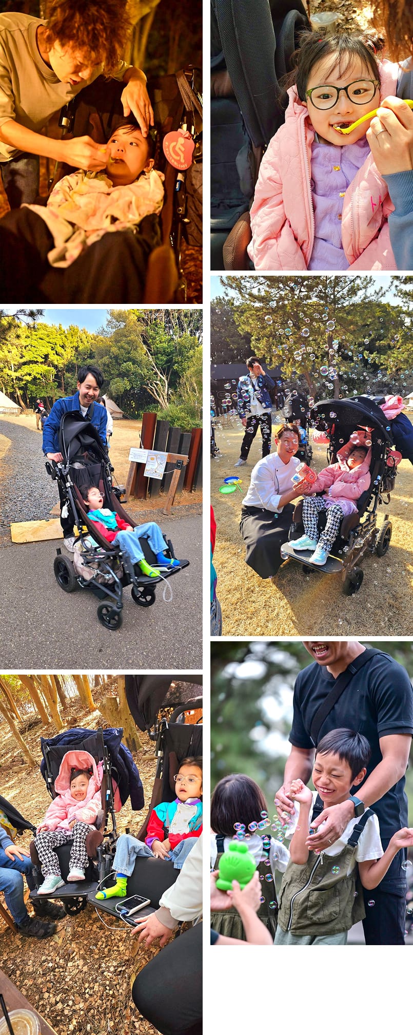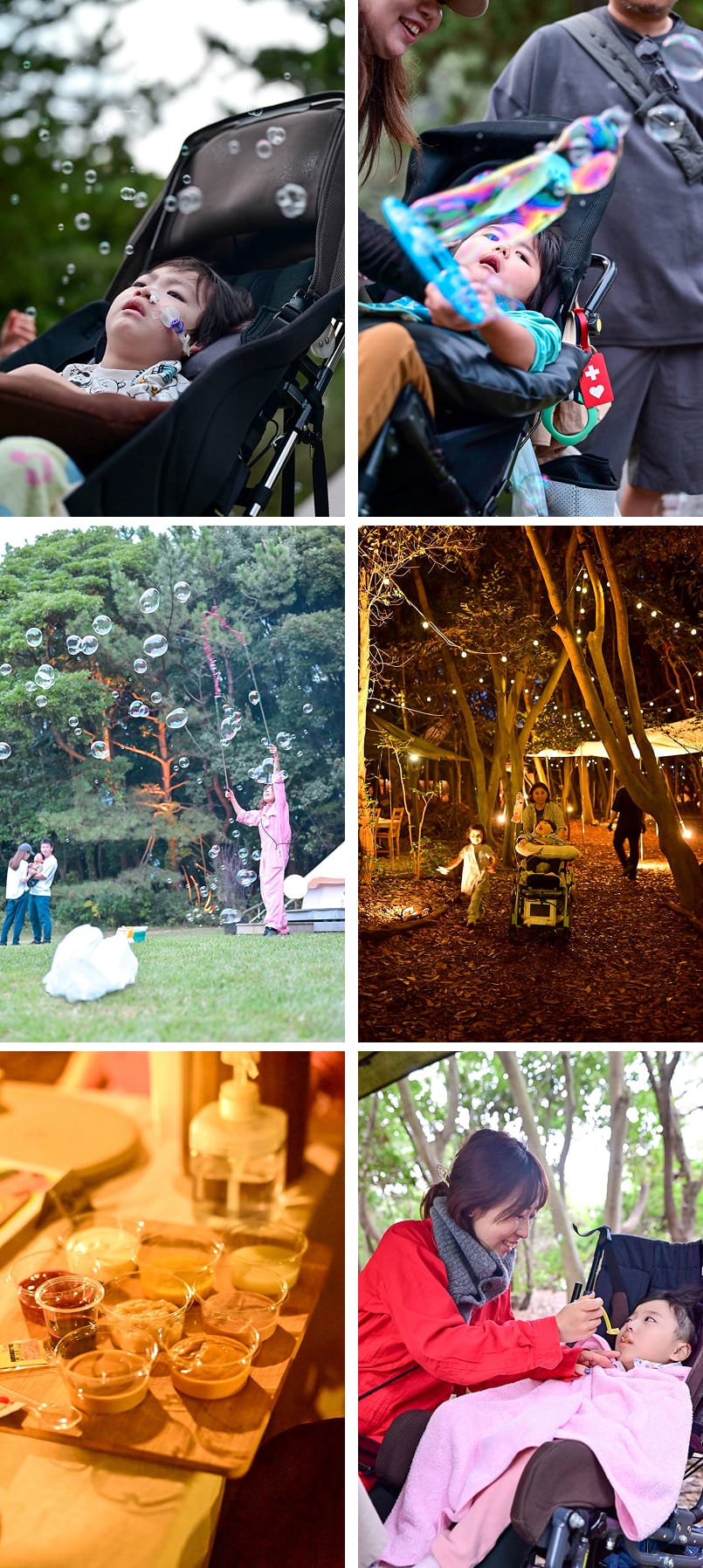 活動中は、参加者同士が安心して交流を深められるよう、様々な工夫を凝らしました。日中は広大な草原で、身体に不自由があっても楽しめるよう、大きなスティックや電動のバブルガンを使ったシャボン玉遊びを行い、障害のある子もない子も一緒になって笑顔が溢れる時間となりました。夕食は、グランビング施設専属シェフのご協力により、嚥下食に対応した特別なBBQを堪能。食事の様子や家族のふれあいをプロのカメラマンに撮影していただき、食後にはその日の写真を使った上映会を開催し、参加者全員で感動を分かち合いました。