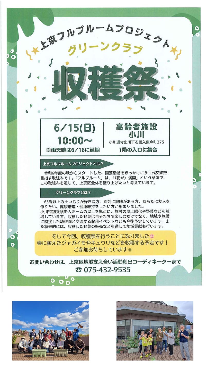 土いじりの好きな方、何か始めてみたい方、ご自身の健康寿命の延伸のために集まったメンバーで小川特別養護老人ホーム屋上を拠点として野菜や果物、夏はグリーンカーテンを栽培し、栽培したものを近くにお住いの地域の方も招待してポテトサラダやふかしいもをふるまった。(収穫祭)