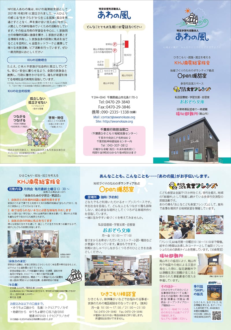 従来ひきこもりの定義として固定的なパターンを想定した支援マニュアルが行政向けに作られ、ともすればそれが行政窓口などでの融通の利かない対応を生み相談者を失望させることにもなっていた。ひきこもりの態様は百人百様で、求められる支援方法も異なる。これまで、家族会としてやってきたことは主に月例の学習会が中心だったが、課題解決のためにはさらに踏み込んだ取り組みを必要としていた。その一つが給食活動、いわゆる「こども食堂」であるが、当法人としては「おとな・こども食堂フレンズ」という名称を立ち上げ、本格的にはこの4月から運営する。すでに市内で先行して給食活動している他のサークルと協働し、新たに多世代交流型の居場所づくりを進めている。当面月1回の開催とし、「食堂」とセットでイベントなども行い関心度を高めるようにしたい。