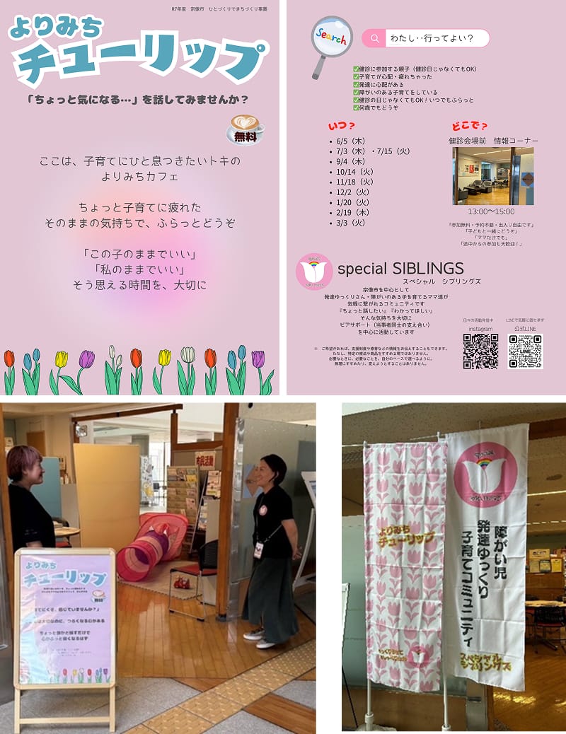 今回乳幼児健診でのピアサポートカフェ『よりみちチューリップ』を実行するにあたり、前例のない取り組みであったため、自分たちの理想や思い描く空間を現実にしていくことからのスタートだった。自分たち当事者である障がい児ママとして、辛かった健診・未就学時代の過去の気持ちを思い出しながら、何があれば元気が出たのか、どのような言葉かけや寄り添いがあれば頑張れただろうかと想像しながら企画した。企画から実行は宗像市コミュニティ協働推進課の協力のおかげで実行許可へ繋げられた。月2回の3歳児健診のうち1回からスタート。30組ほどの親子の中に毎回、発達課題がありそうな親子数組(3組前後)という状況の中のスタートであった。健診中に泣き叫ぶ子や会場から離室して落ち着かない子等、それを追いかけまわす母親の姿もあった。私達は、障がい児子育ての中で養った母の勘から発達特性のある子は健診会場に入っていく様子を見て察知することも出来たため、どのようにこの場に来てもらえるかの雰囲気づくりや声掛けなどをスタッフ間で相談しながらトライ&エラーを繰り返しながら工夫した。毎回2-3組来ていただくことが叶い、リピーター(健診日以外)の参加くださる親子とのご縁も得られた。開催後はインスタグラムのフォローに繋がり、お礼のメッセージが届くなど嬉しい結果となり、今後もつながりが継続して困った時・悩んだ時はいつでも相談できる場やつながりを継続していきたい。