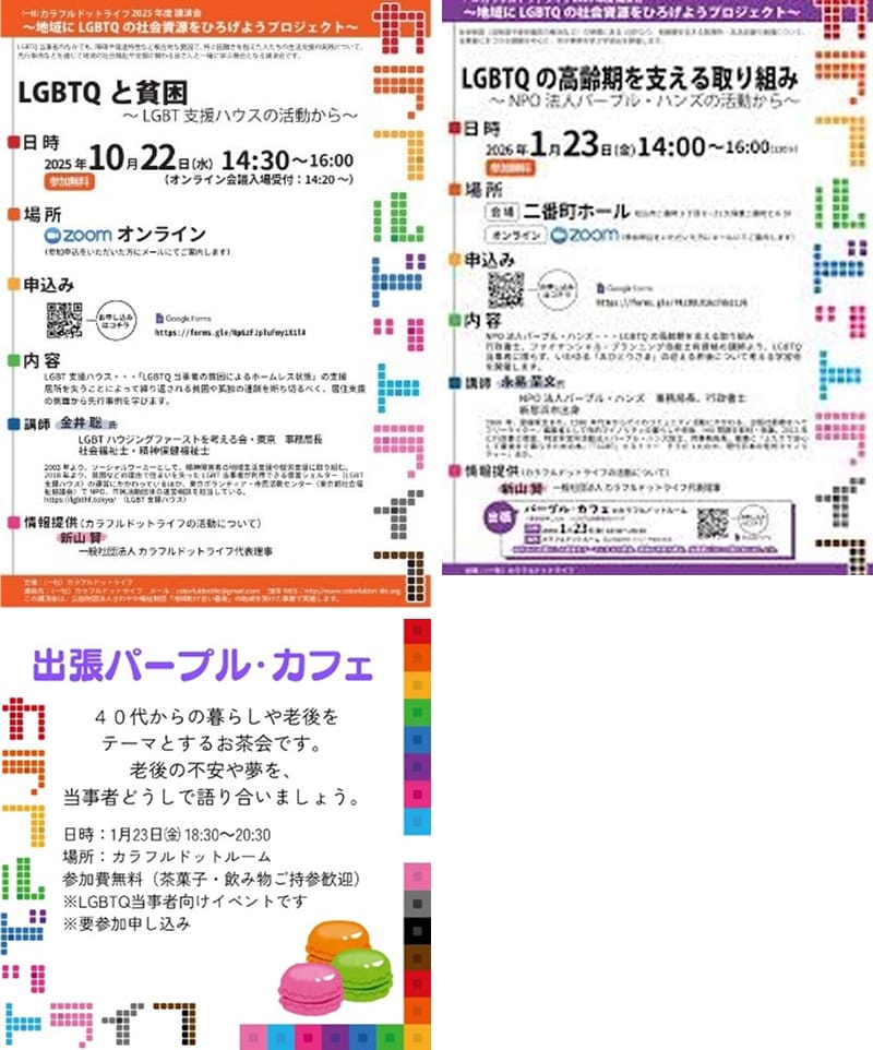 試行開催「出張パープル・カフェ」(2026年1月23日):学習会と同日に、中高年層のLGBTQ当事者を対象とした居場所サロンを自団体のルームで試行しました。
