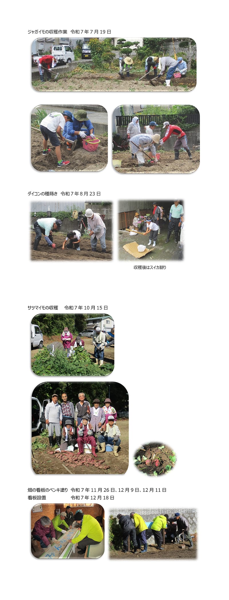 今後を見据えて、活動の幅を広げていきたく、今年度は新たに高齢独居女性所有の畑作業も一緒に手伝いながら、場所を借り、そちらの畑にサツマイモを植えてみて、収穫を地域内の保育施設の子ども達と行いたいと考えています。また、畑に立てている看板についても、ことしで3年目ということで色褪せが気になるところですので、そちらの塗り替え作業も予定しています。