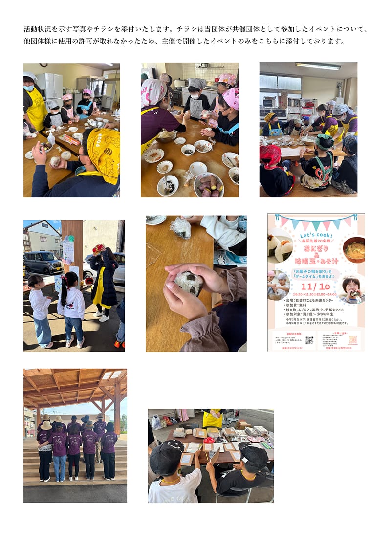 本助成金を活用し、当団体は2025年6月および11月に、被災地の子ども食堂が主催するイベントへの参加および主催イベントを通じて、子どもたちとその家族、地域住民を対象とした食育・体験型の支援活動を実施しました。